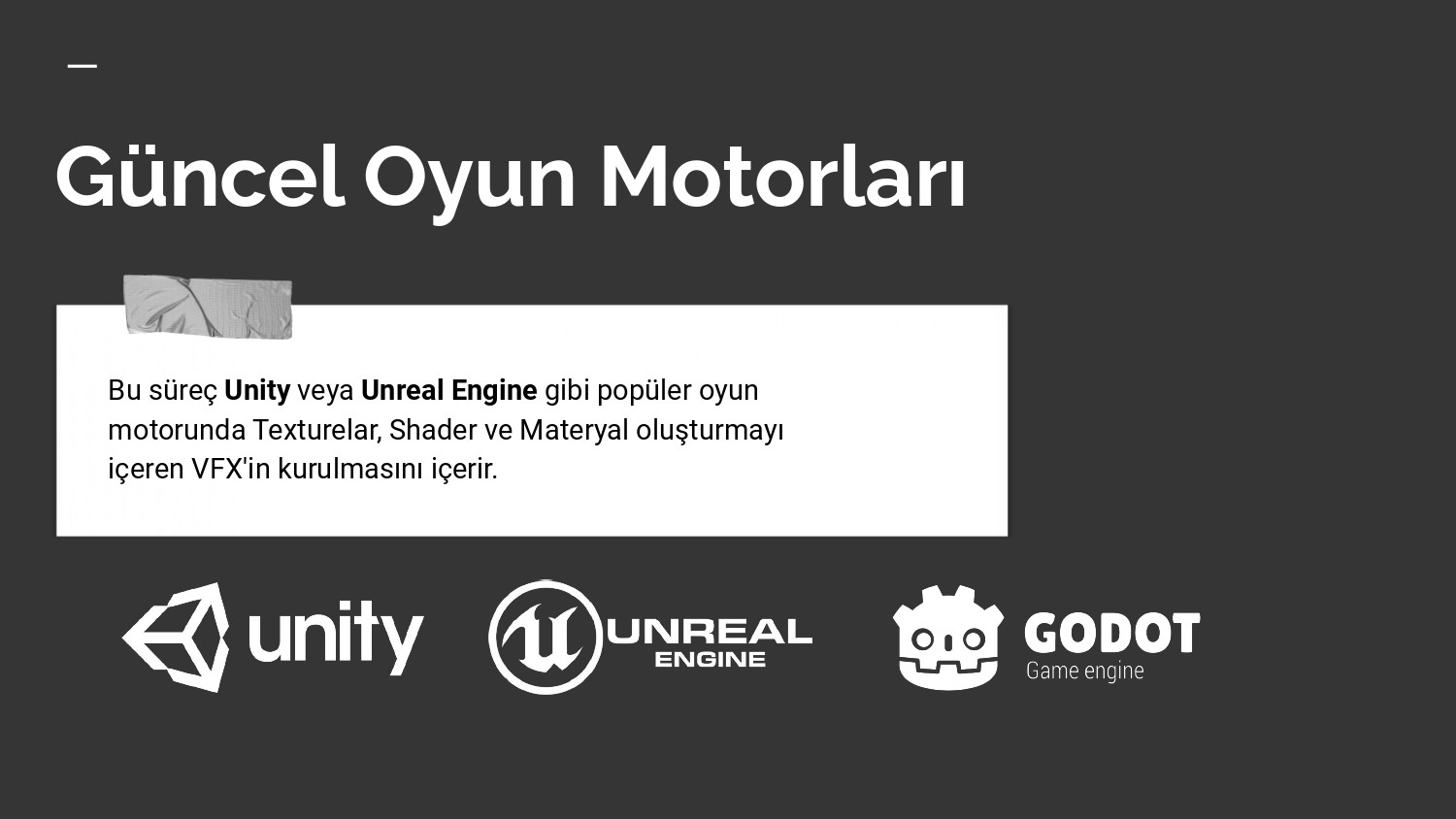 Bu süreç Unity veya Unreal Engine gibi popüler oyun motorunda Texturelar, Shader ve Materyal oluşturmayı içeren VFX’in kurulmasını içerir.