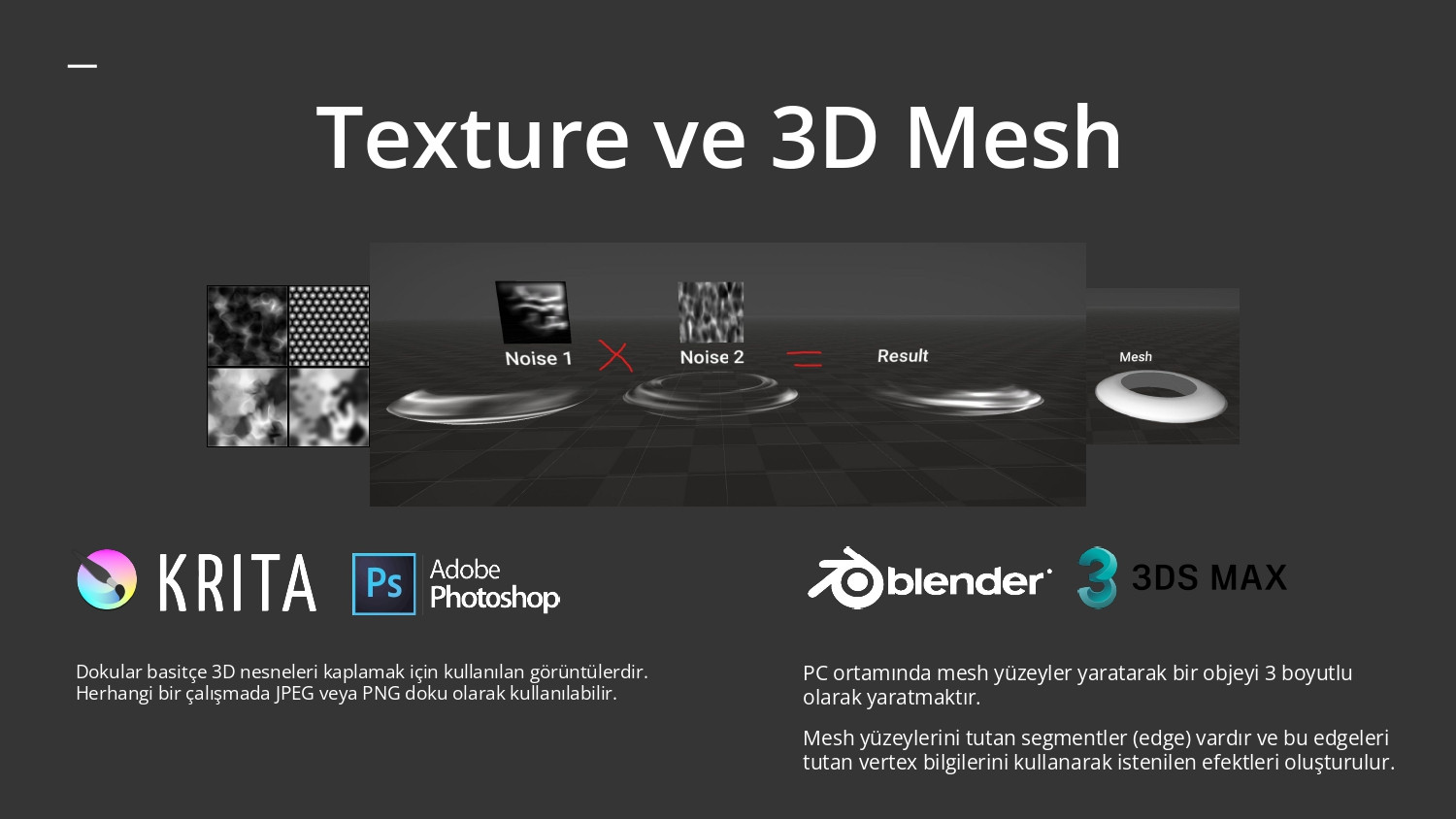 - Krita, Adobe Photoshop ve Photopea gibi uygulamalarla texture oluşturabiliyoruz.