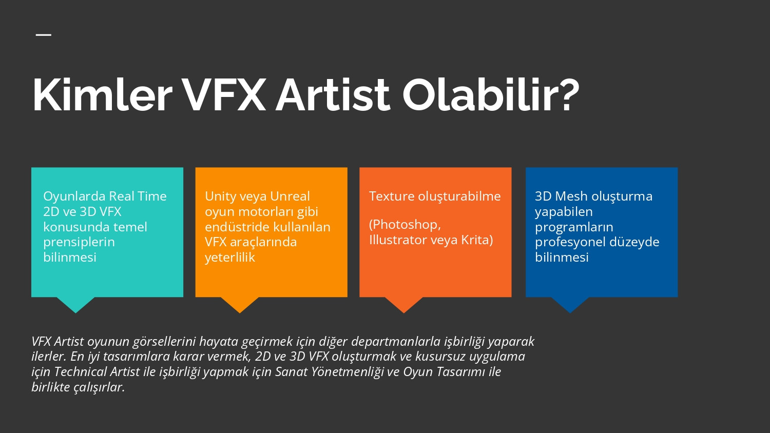 - Oyunlarda Real Time 2D ve 3D VFX konusunda temel prensiplerin bilinmesi,